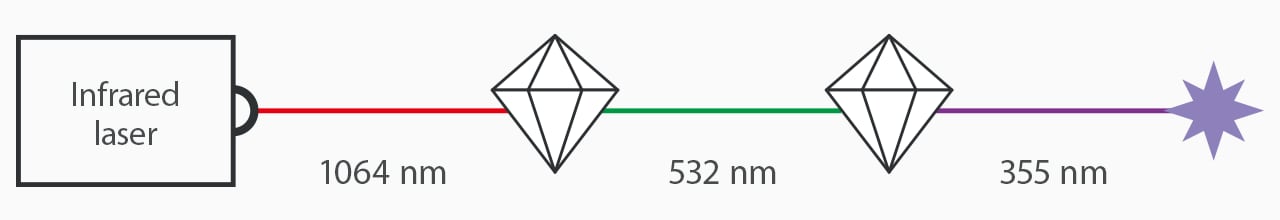 First, a 1064 nm laser is converted into a 355 nm laser through two crystals. Then, the 355 nm beam breaks down bonds directly using a photolytic degradation process. This process is known as “cold marking” because it does not burn surface areas and uses minimal heat stress.
