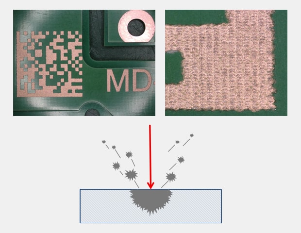 Due to its shortened 355 nm wavelength, the absorption rate of UV laser light skyrockets. This allows the MD-U to perform "cold marking" completely negating any thermal impact to the FR-4 Coating and keeping the underlying copper untouched.