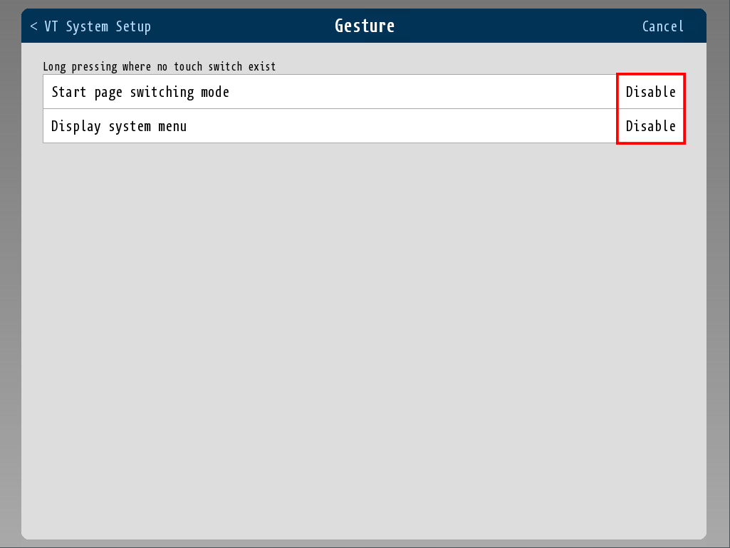 4. Set “Start page switching mode” and “Display system menu” to “Disable.”