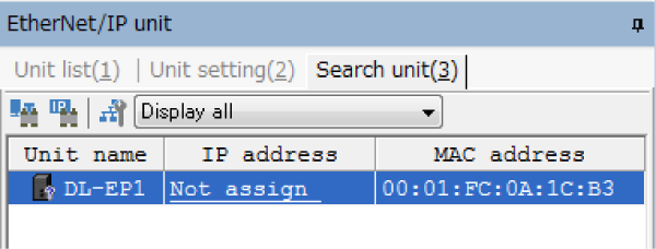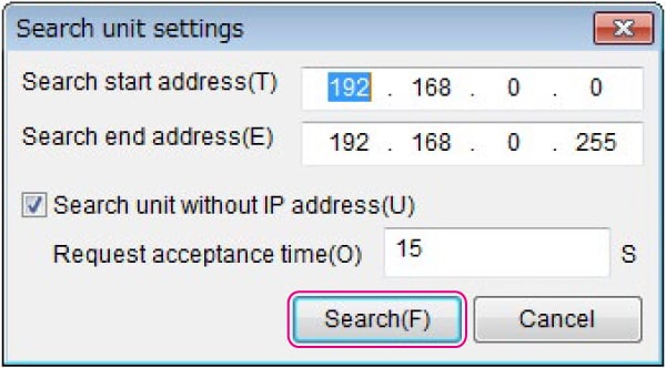7. When transfer of the project is completed, the [Search unit settings] dialogue is displayed. Then click [Search (F)]. After the auto configuration is completed, "Vendor Series" is automatically registered. Then click [OK] to close the [EtherNet/IP settings] window.