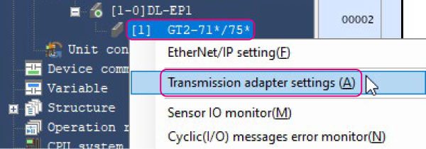 1. Expand the unit configuration in the workspace. Right-click on "Vender Series" and select [Transmission adapter settings (A)].